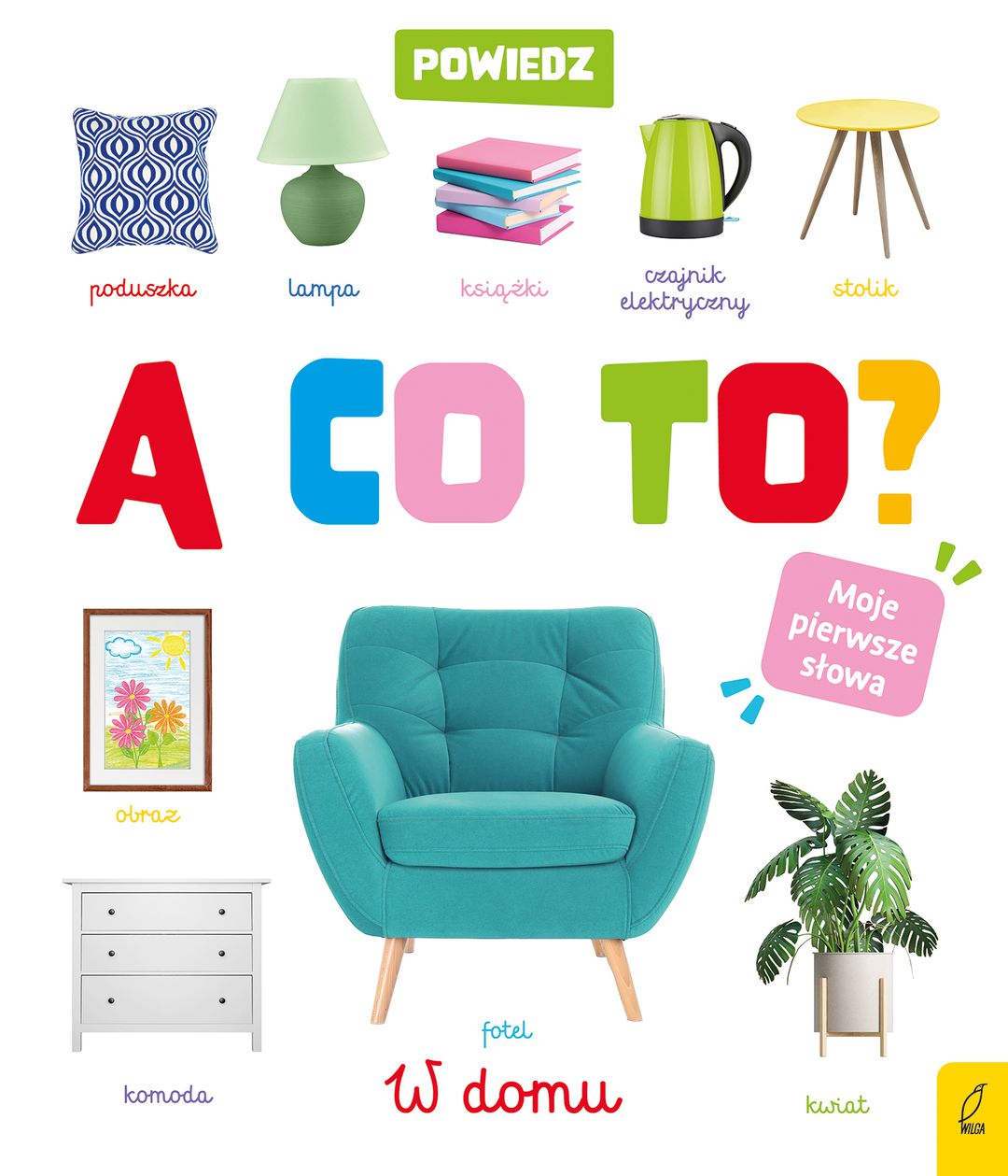 Powiedz a co to? W domu ta siążka przedstawia rzeczy, zwierzęta i rośliny, które dziecko może spotkać w najbliższym otoczeniu: w pokoju, w kuchni, czy w łazience. Maluch uczy się rozpoznawać przedmioty codziennego użytku i kojarzyć je z ich nazwami.